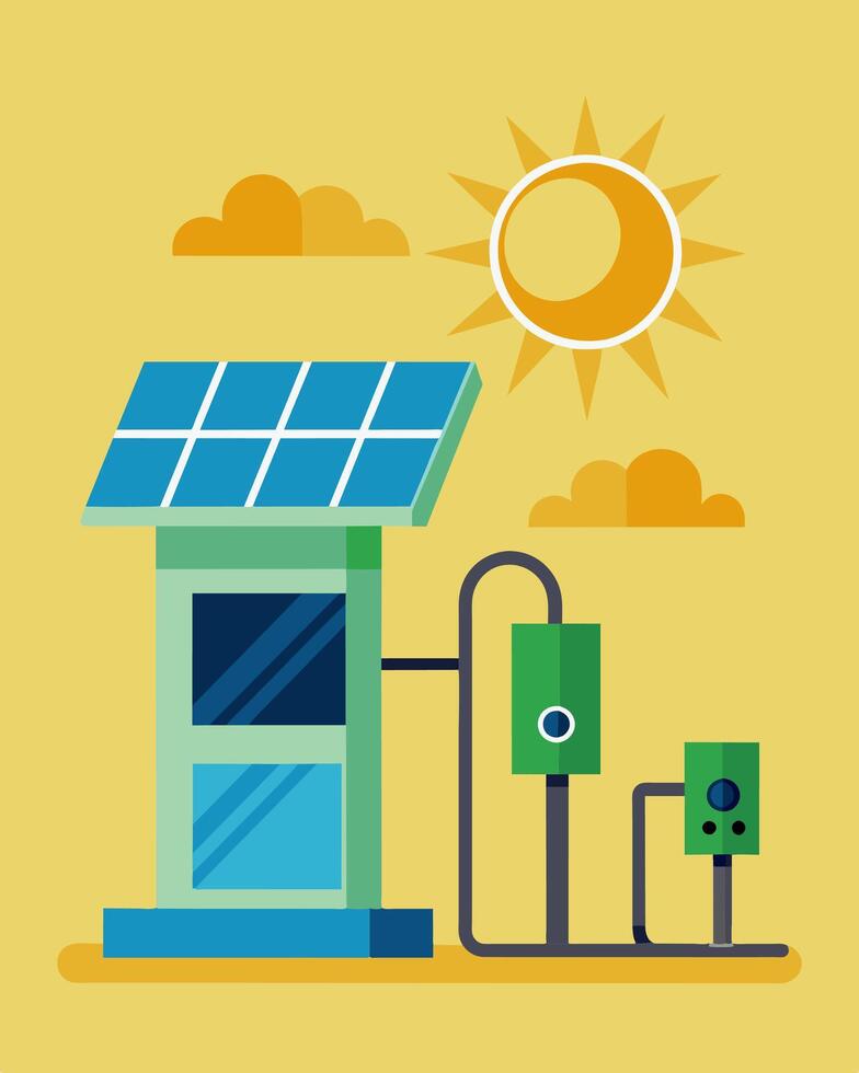 The solar panels on the charging station tilt towards the sun soaking up its rays and converting them into power for the many vehicles that will stop by throughout the day.. Pro Vector