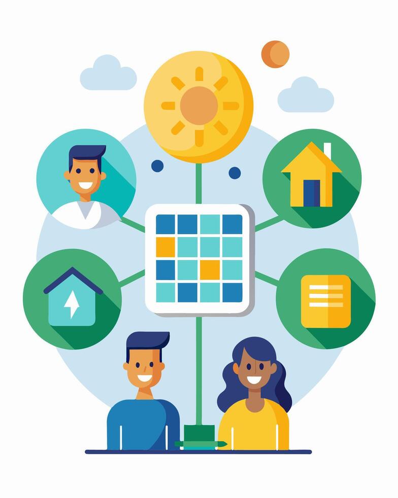 With a community forum users can connect with others and share tips and tricks for maximizing solar energy usage.. illustration. Pro Vector