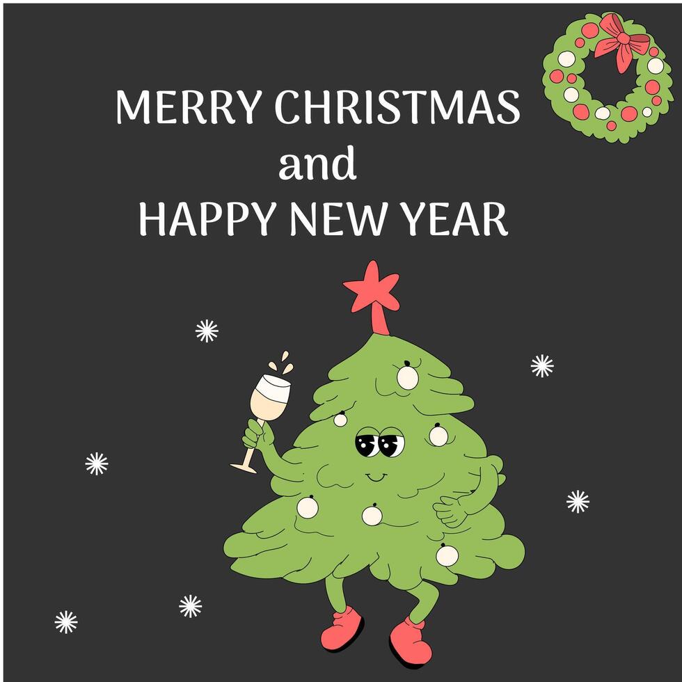Christmas groovy banner with cartoon characters. Xmas square background. Merry Christmas and Happy New Year banner template. Groovy y2k characters and elements background. Pro Vector