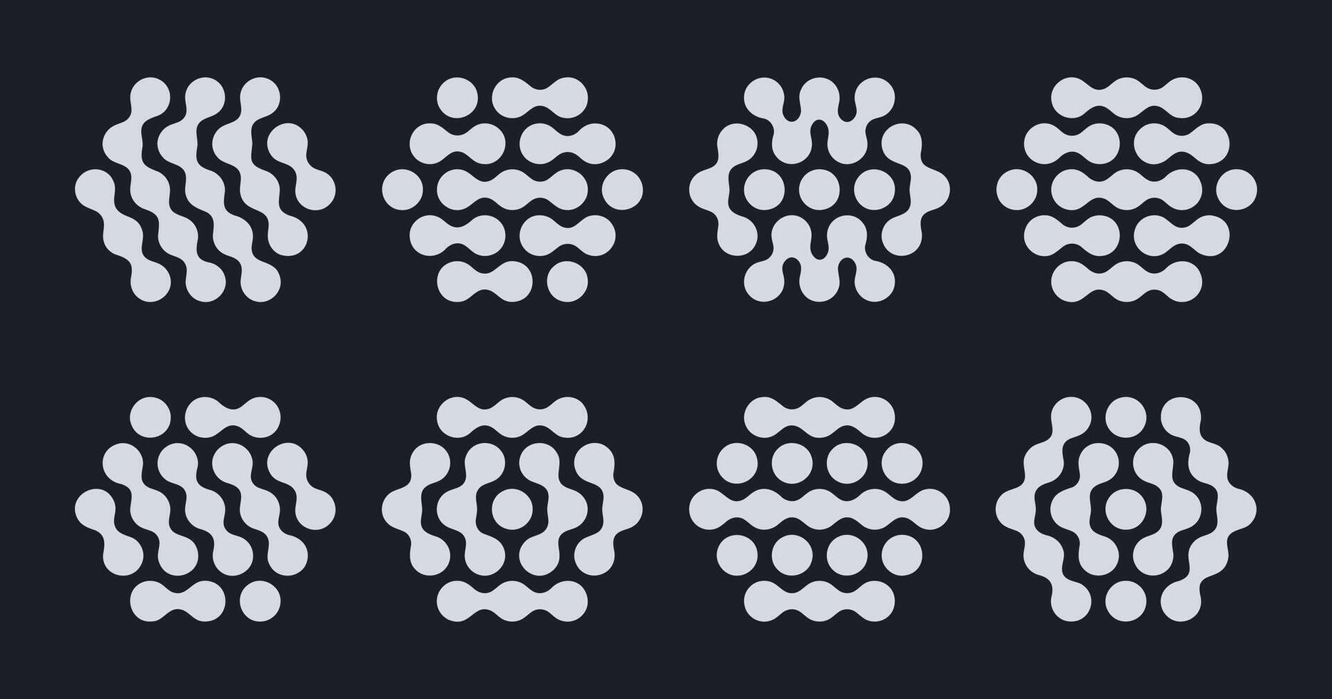 Metaball hexagon shapes. Connected liquid molecule figures, abstract liquid spotted graphic design elements flat illustration set. Honeycomb metaball blob shapes Pro Vector
