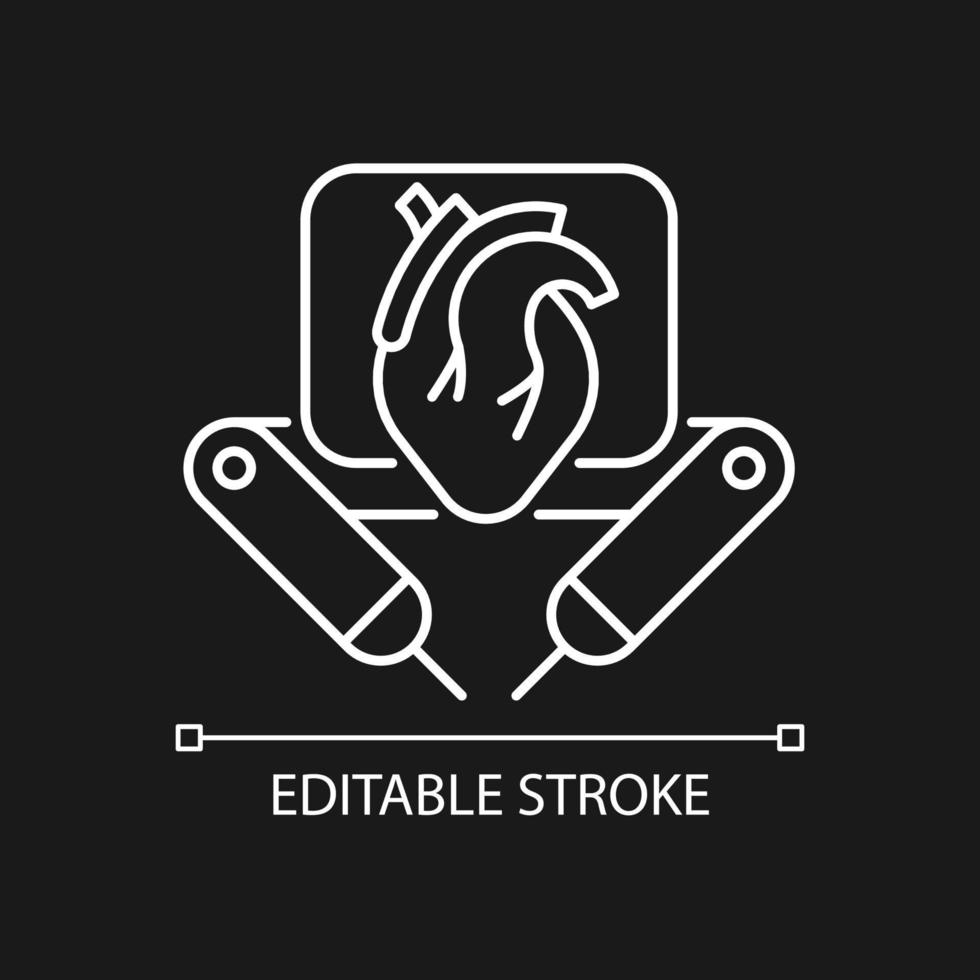 Surgical robot white linear icon for dark theme. Remote manipulation. Robotic-assisted procedure. Thin line customizable illustration. Isolated vector contour symbol for night mode. Editable stroke Pro Vector