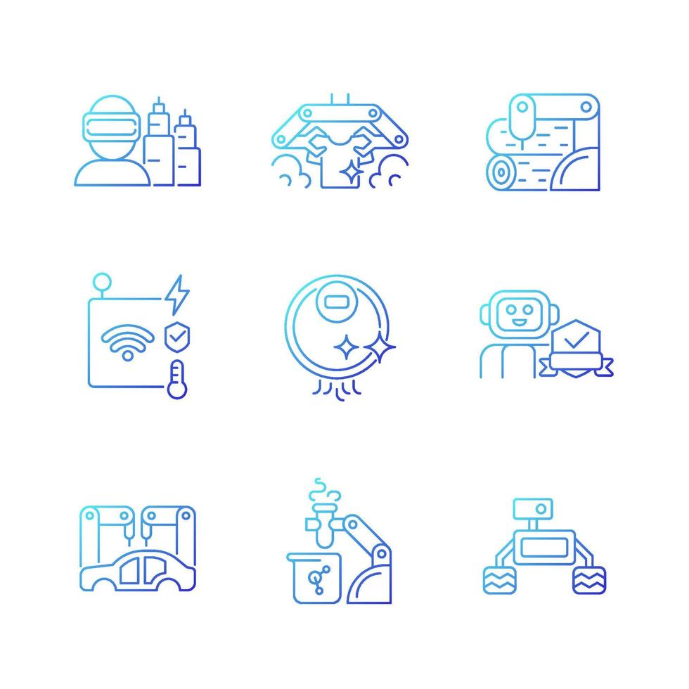 Automation technologies gradient linear vector icons set. Manufacturing robots. Automated laundry and cleaning. Thin line contour symbols bundle. Isolated outline illustrations collection Pro Vector and Pro SVG