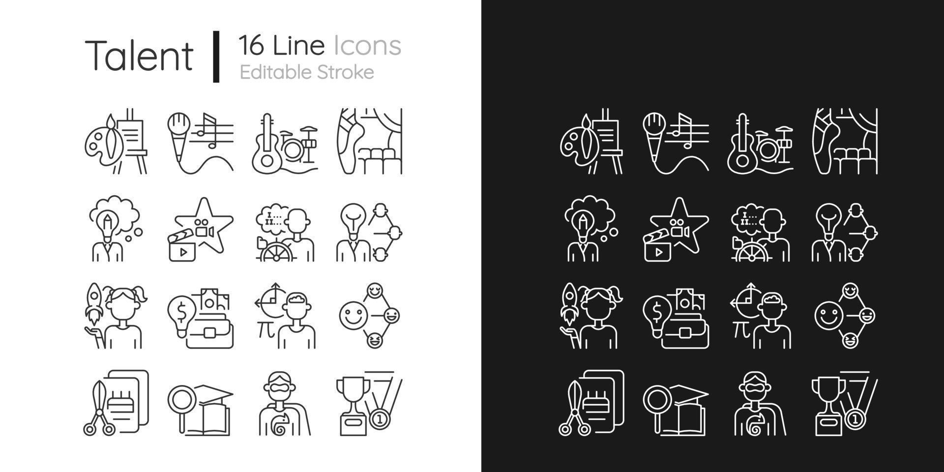 Talents and aptitudes linear icons set for dark and light mode. Vocation. Thin line contour symbols bundle. Customizable thin line symbols. Isolated vector outline illustrations. Editable stroke Pro Vector