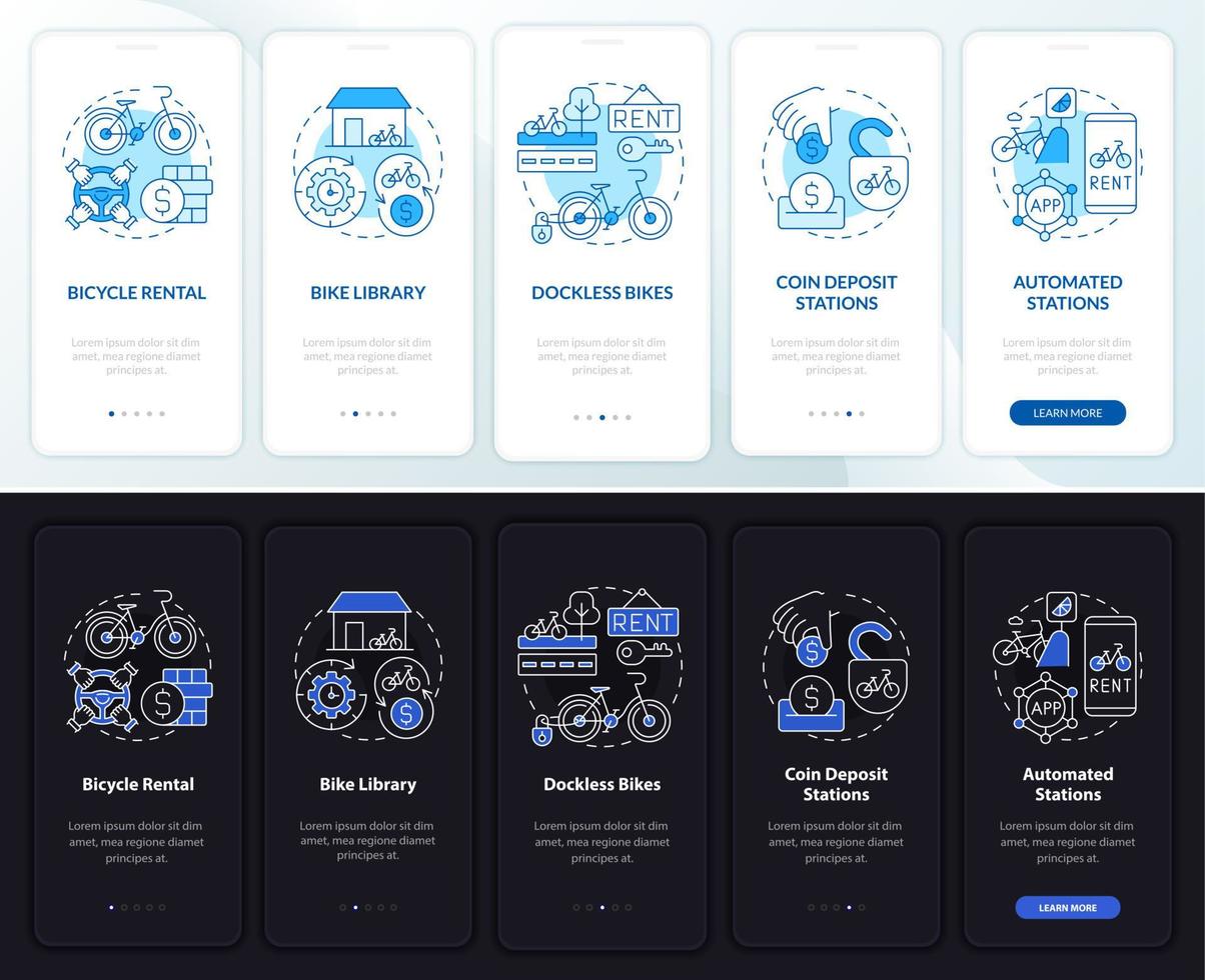 Bike-share categorization onboarding mobile app page screen. Rental walkthrough 5 steps graphic instructions with concepts. UI, UX, GUI vector template with linear night and day mode illustrations Pro Vector