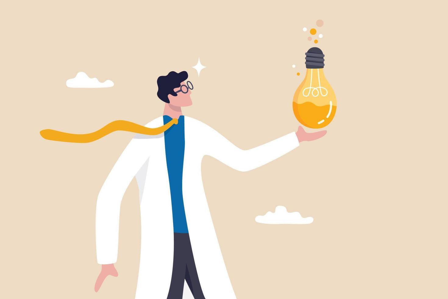 Experiment new creative idea, research to discover and invent new product, entrepreneurship mindset or business analysis concept, businessman experimenting new idea lightbulb to invent new product. Pro Vector