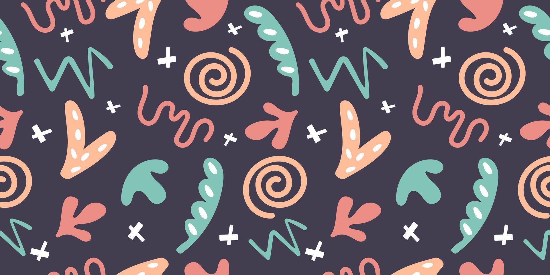 Colourful seamless doodle pattern with simple shapes. Hand drawn minimalist style on dark background. Pro Vector