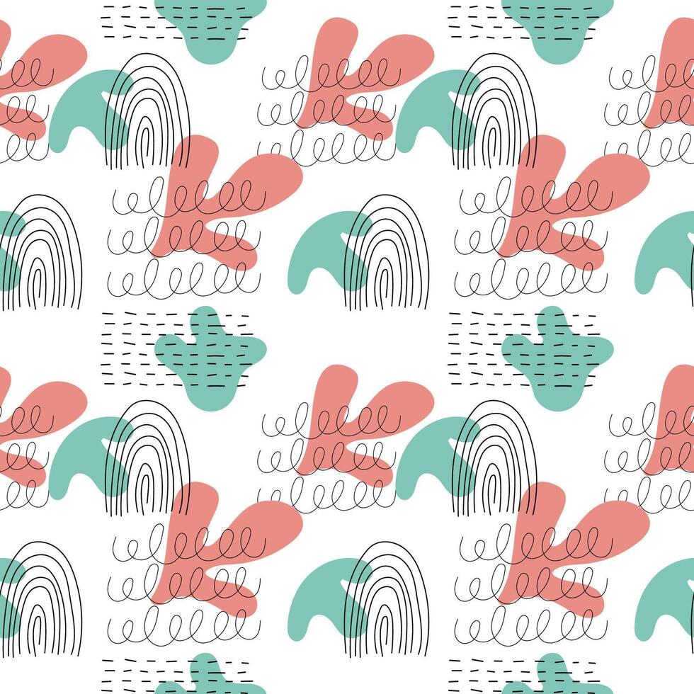 Seamless pattern with handdrawn abstract spots, rainbows and scribbles. Pro Vector