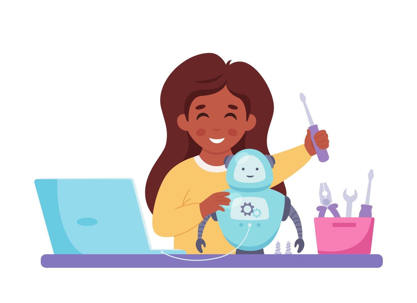 Little girl building a robot. Robotics, programming and engineering for kids Pro Vector