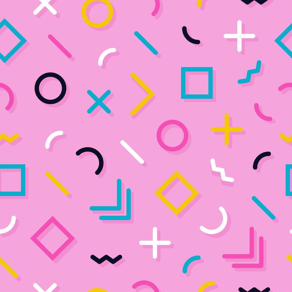 Memphis seamless pattern. tile with different geometric elements and lines. Abstract minimal design on pink background for wrapping paper, textile, posters. Pro Vector