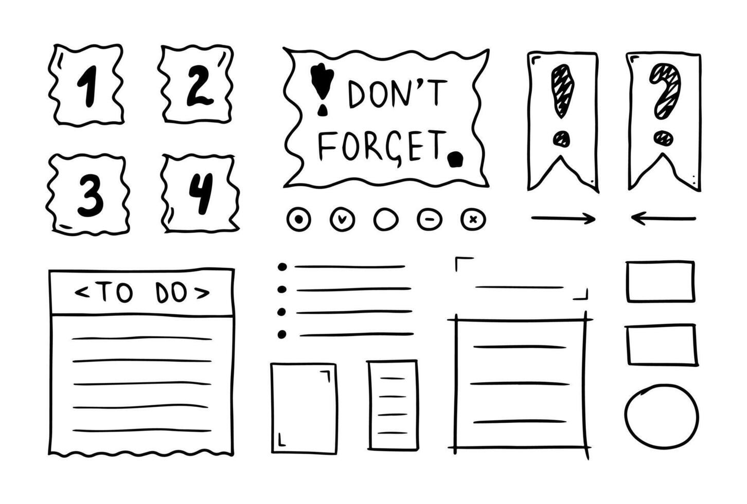 Doodle black bullet journal. Hand drawn elements, numbers, month names and days of the week, stickers, planner labels. Sketch scribble style. illustration for diary, planner, notebook Pro Vector