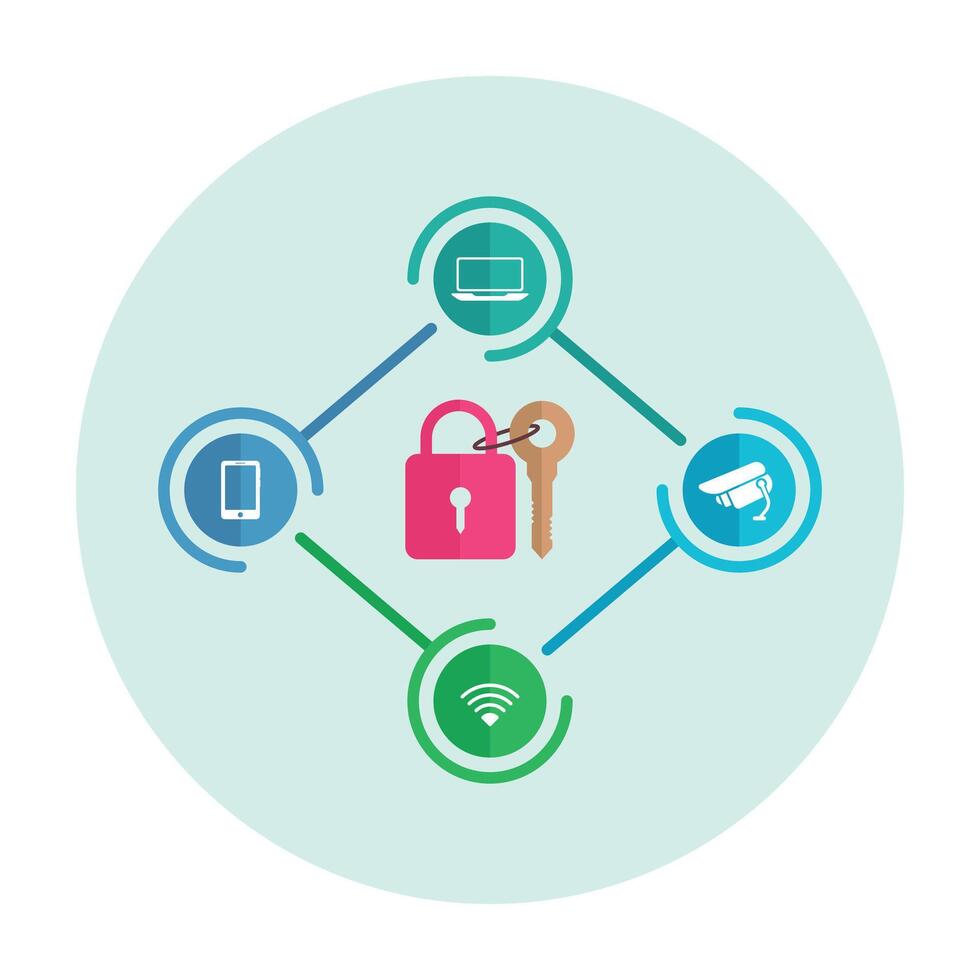 Cybersecurity and Secure Networking Flat Illustration with Lock, Key, and Connected Devices Pro Vector