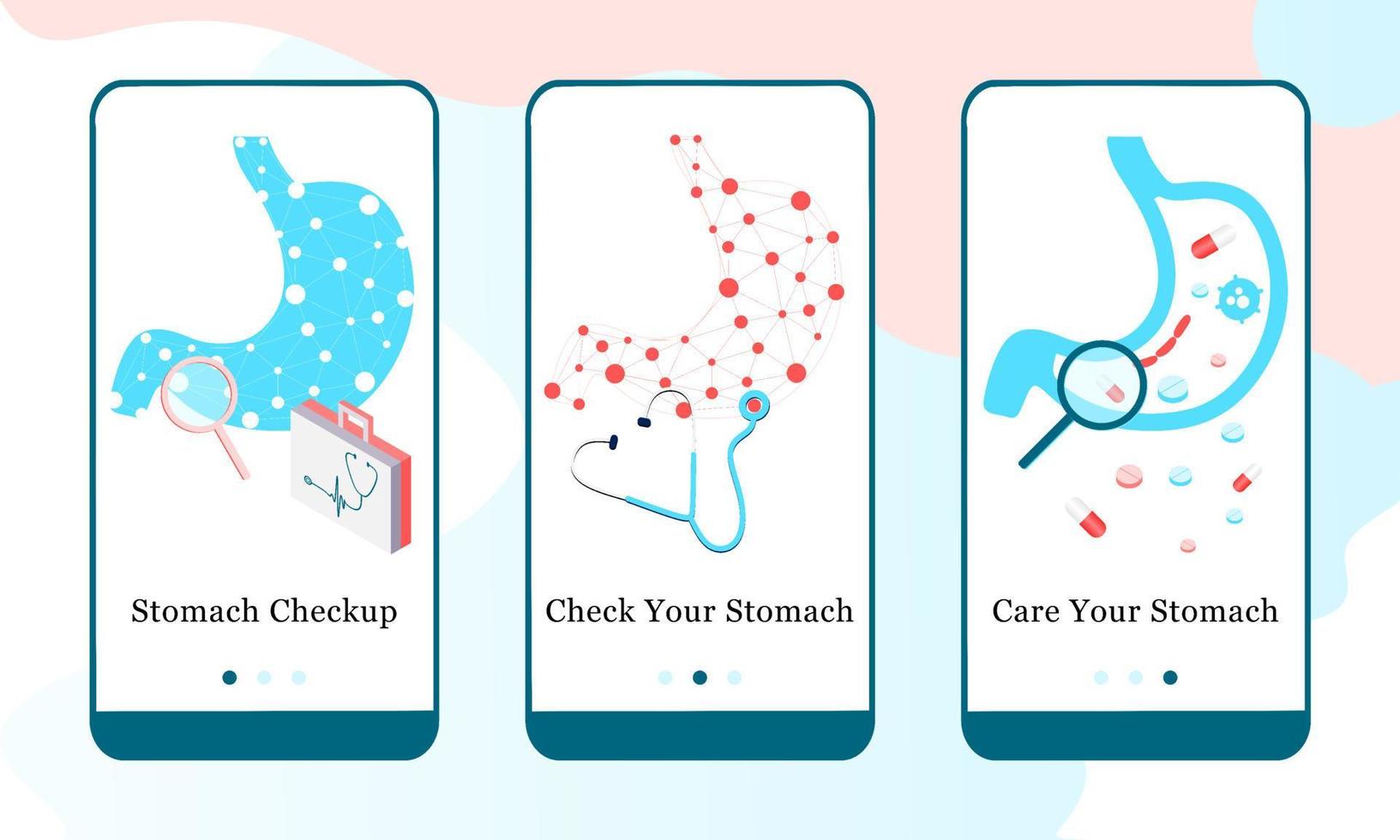 Application design set for Stomach Checkup, Check your Stomach and Care your Stomach. UI onboarding screens design. Mobile app template web site. 3D modern vector illustrations for user interface. Free Vector