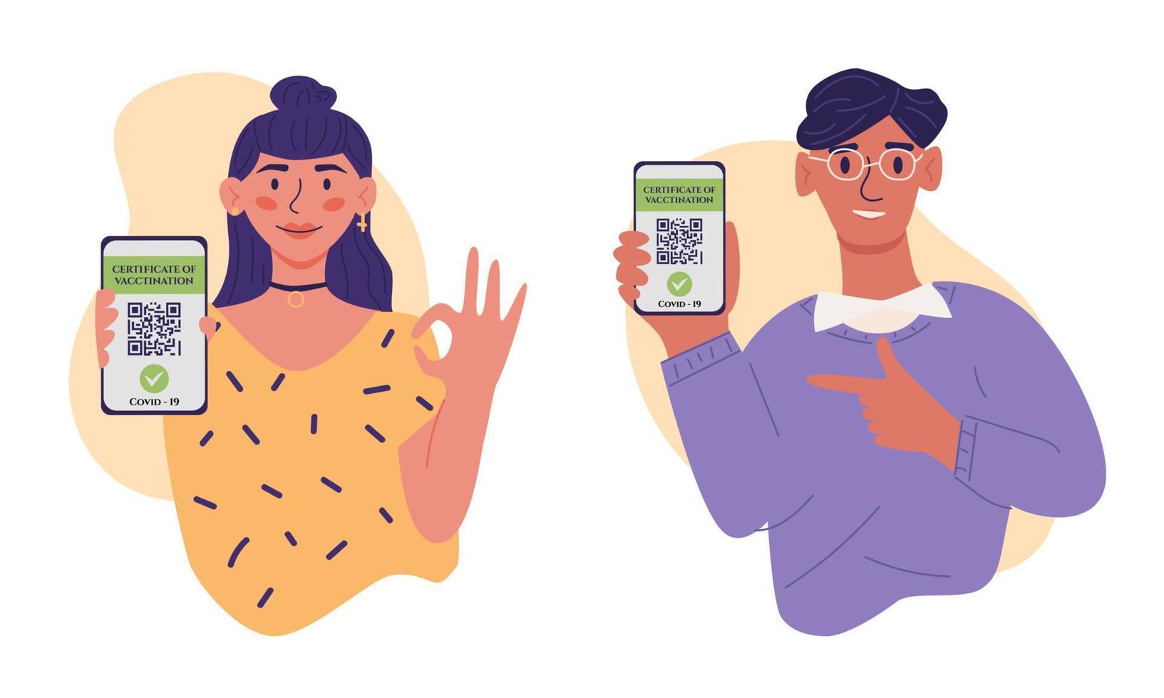 Certificate of vaccination vector flat illustration man and woman showing smartphone with vaccine QR code in mobile app Pro Vector
