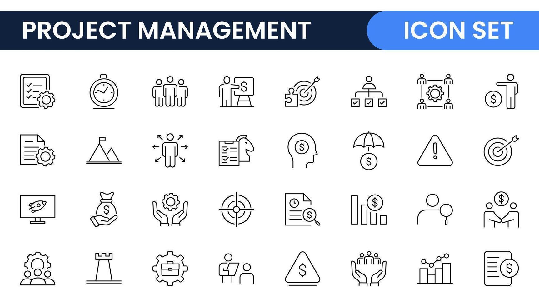 Project Management web icons in line style. Outline icon collection related to Schedule, human resource, management, development, planning, and more. Pro Vector
