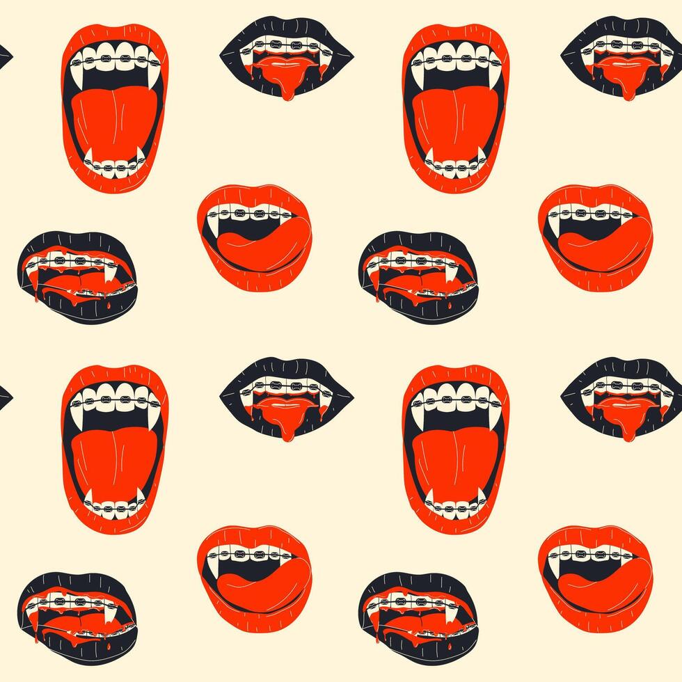 Seamless pattern with Vampire mouth with braces and fangs closed and open female red lips with long, pointed canine teeth Pro Vector