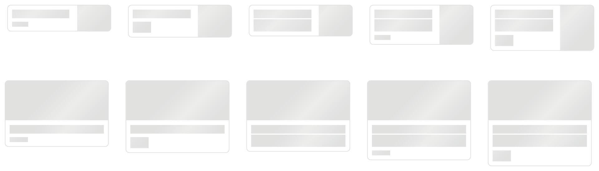set of simple flat website card templates. Landing page wireframe, company site, e-commerce store, forum, social network, gallery, hosting, blog, news portal. Material design system Pro Vector
