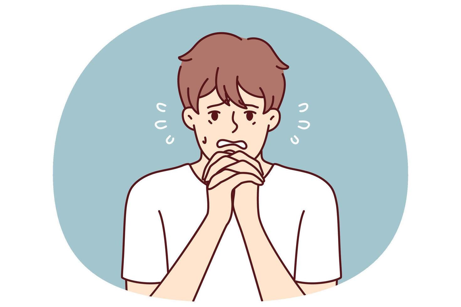 Excited man makes gesture of praying asking lord for help in solving problems that have arisen Pro Vector