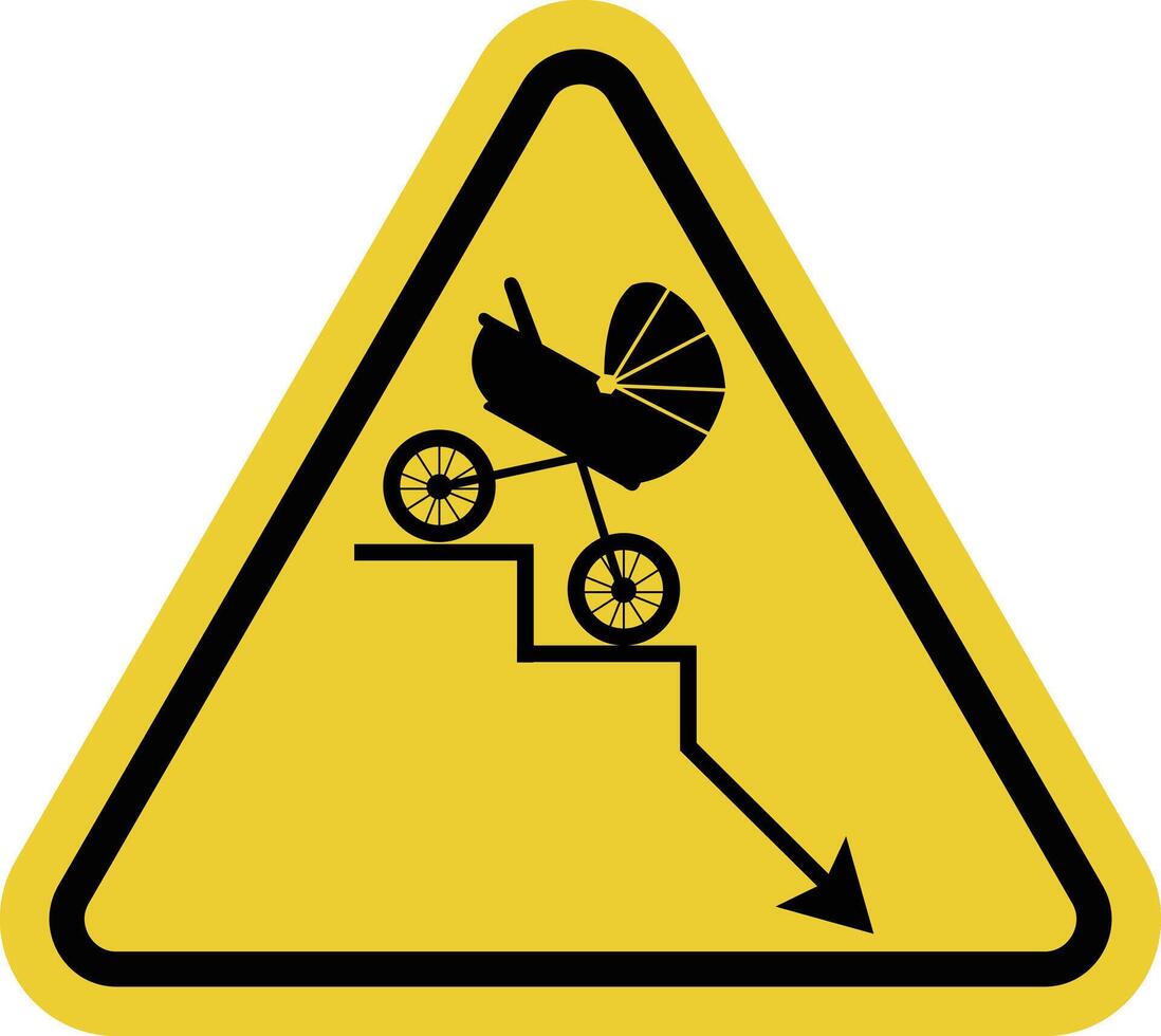 Sign of declining birth rate. Negative fertility graph with an arrow pointing down. Demographic decline, fertility decline curve. Warning yellow triangular sign. Pro Vector