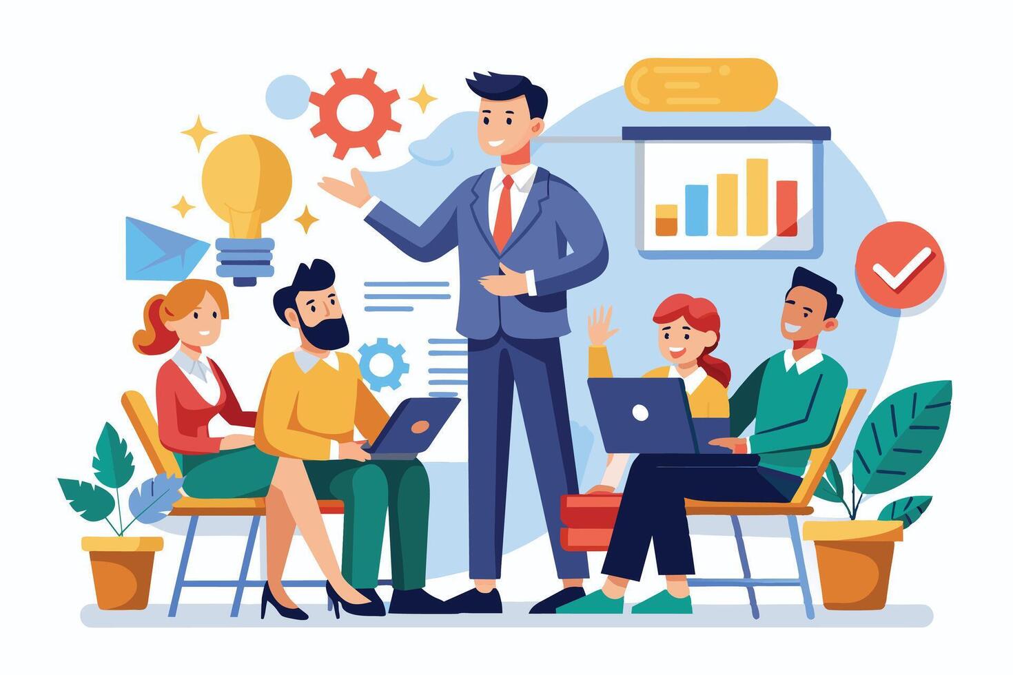 A business team gathers for a meeting, with one presenter standing and sharing ideas and data with colleagues. vector