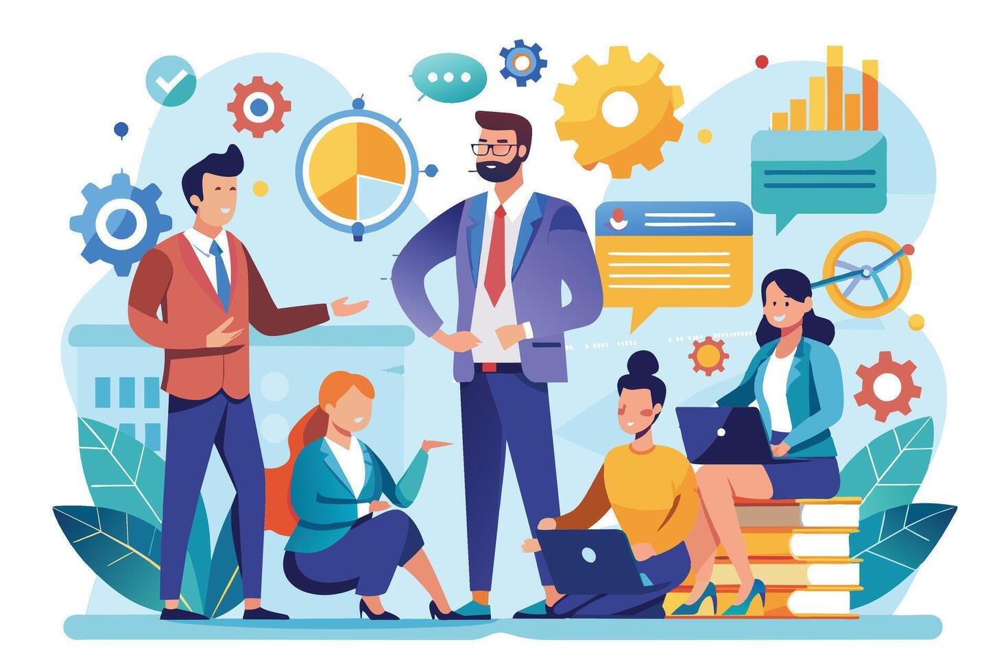 A group of business professionals work together on a project, analyzing data, discussing strategies, and collaborating to achieve success. vector