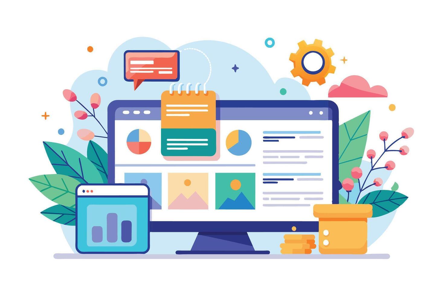 Illustration of a desktop computer displaying a website dashboard with graphs, charts, and data analysis. vector