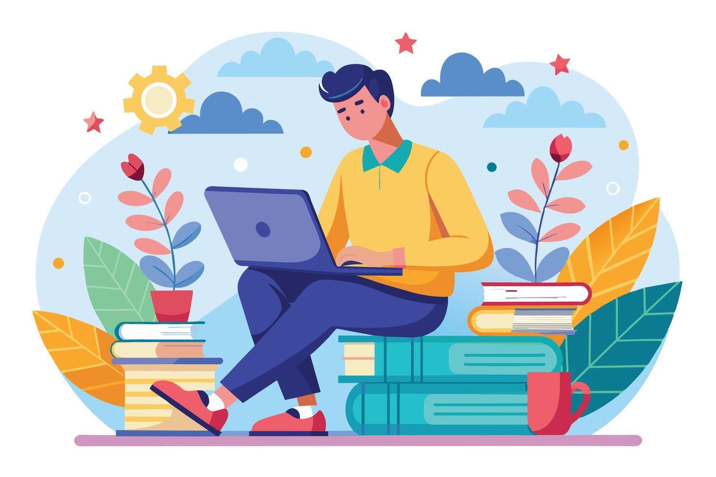 A man sits on a stack of books, working on a laptop. He is in a casual setting, surrounded by nature. vector
