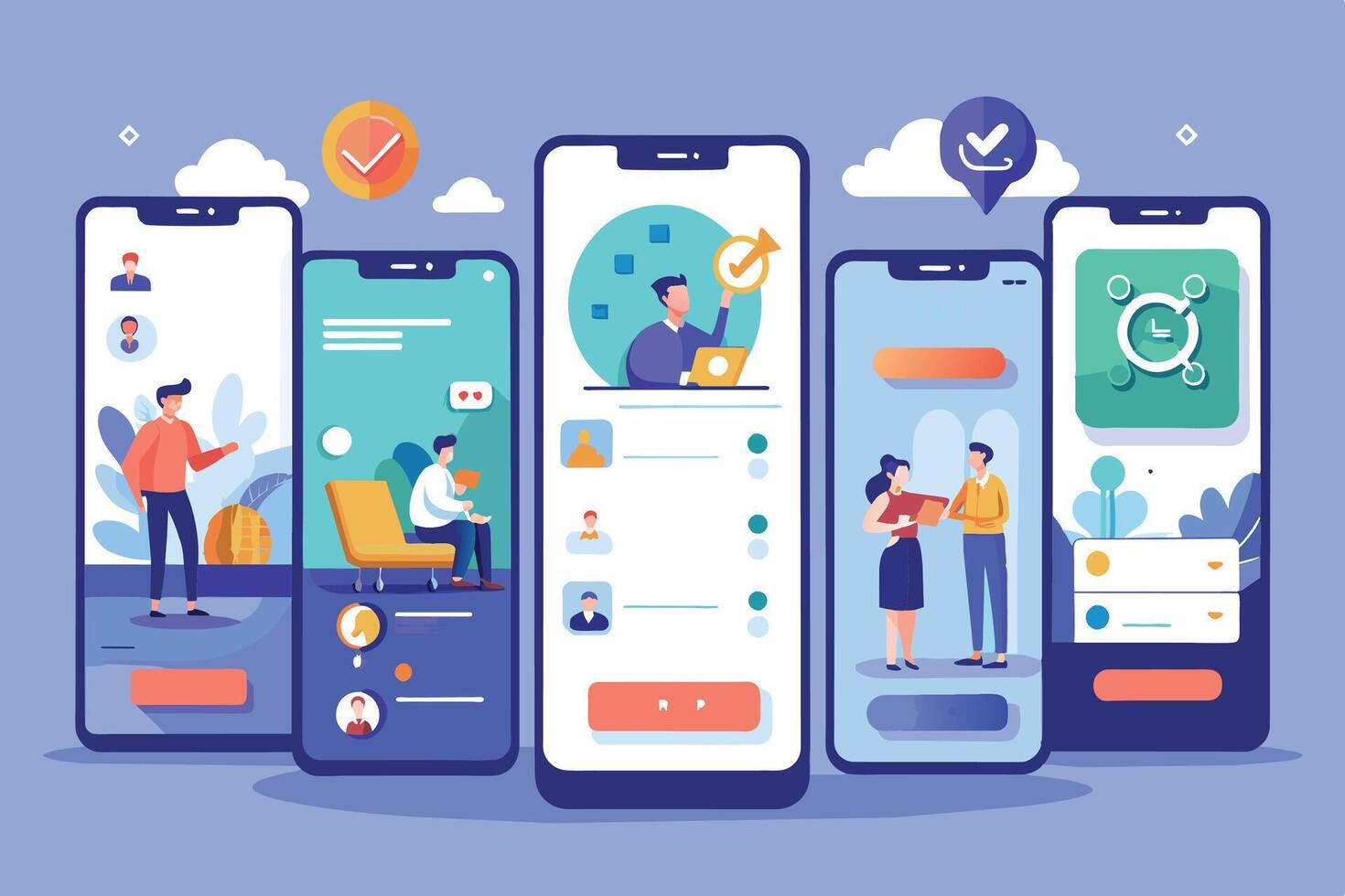 Illustration of five smartphone screens displaying different features of a mobile app. The screens feature checkmarks, icons, and illustrations of people interacting with the app. vector