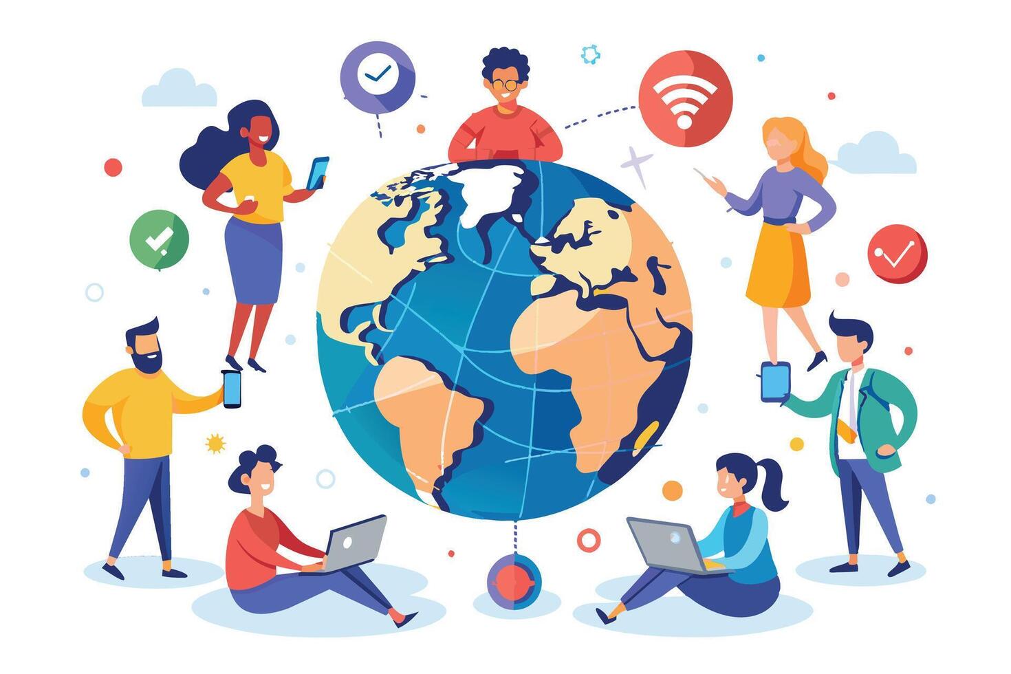 An illustration of a diverse group of people using various technologies, including smartphones and laptops, around a large globe representing the interconnected world. vector