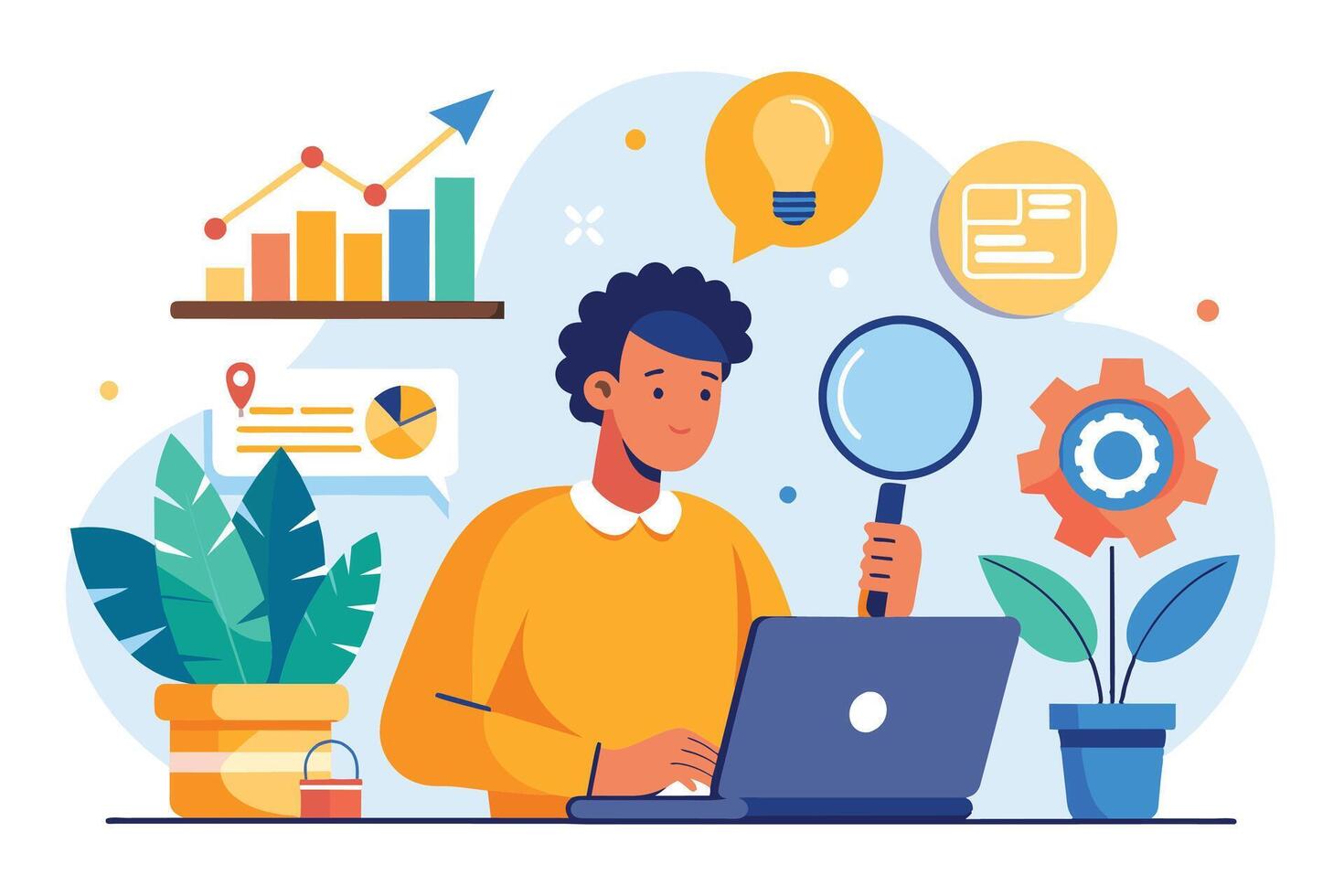 An illustration depicting a person using a laptop to analyze data and search for ideas. There are graphs, charts, and a magnifying glass in the image. vector