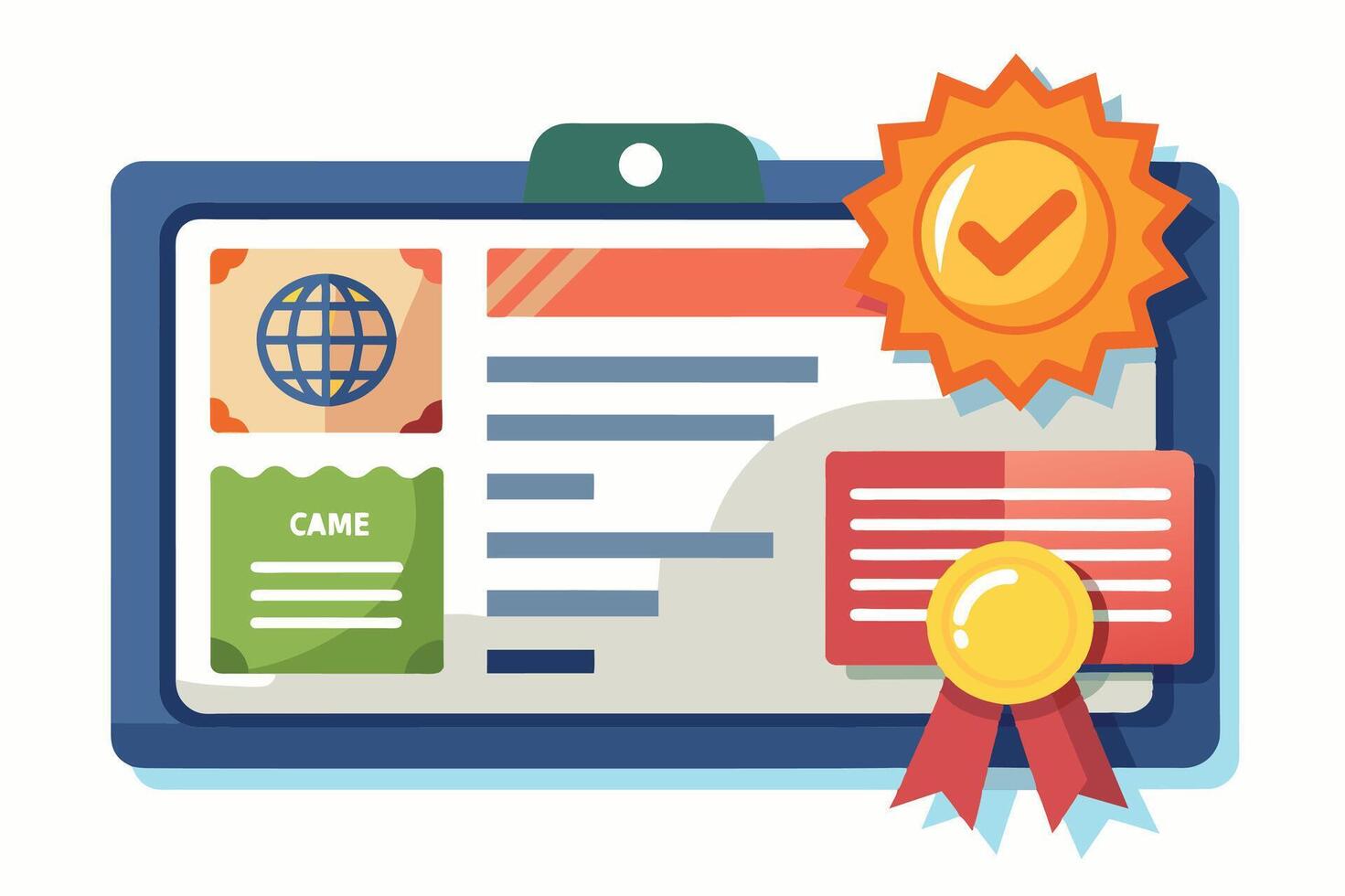 A digital certificate with a globe, a checkmark seal, and a red ribbon, signifying completion of an online course. vector