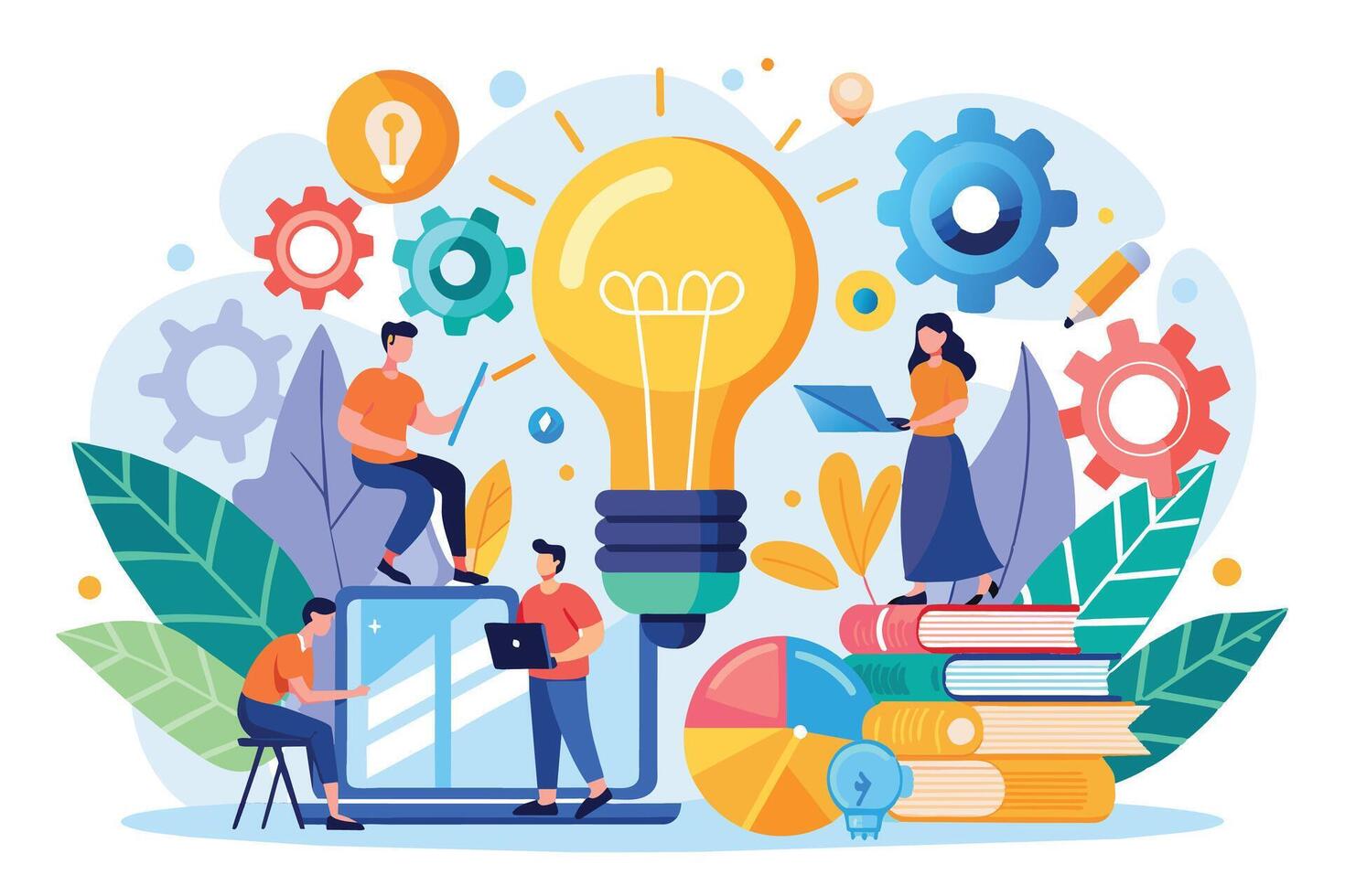 A picture of four people collaborating on a project with a light bulb, gears, and laptop, promotes teamwork, creativity, and problem-solving. vector