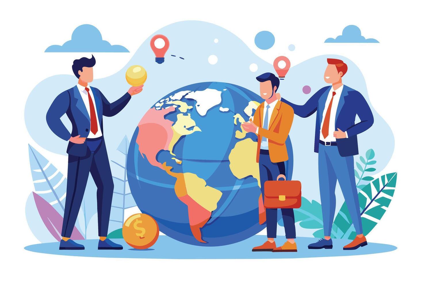 Three businessmen stand in front of a large globe, discussing ideas and strategies for global business. vector