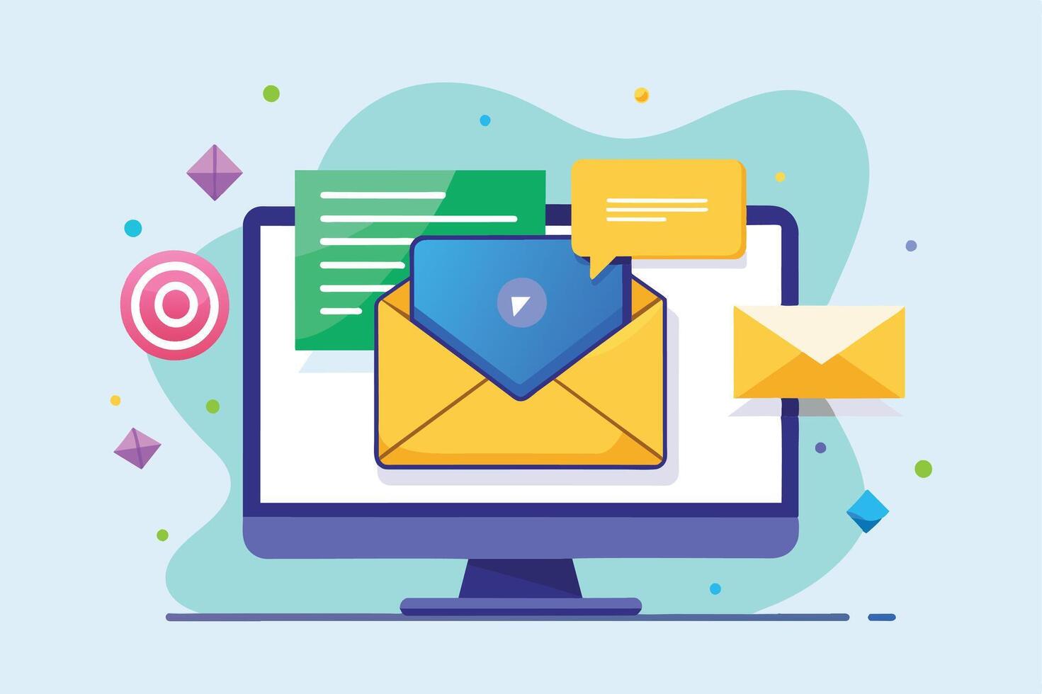 An illustration of a desktop computer displaying an open email with a playing. vector