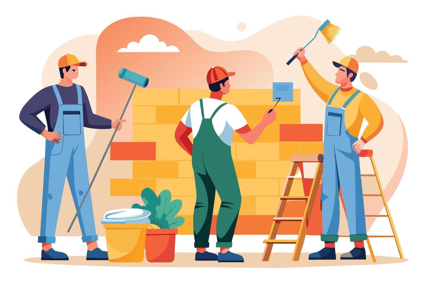 Three painters are working on a brick wall. One is using a roller, another is using a brush, and the third is standing on a ladder and pointing to a spot on the wall. vector