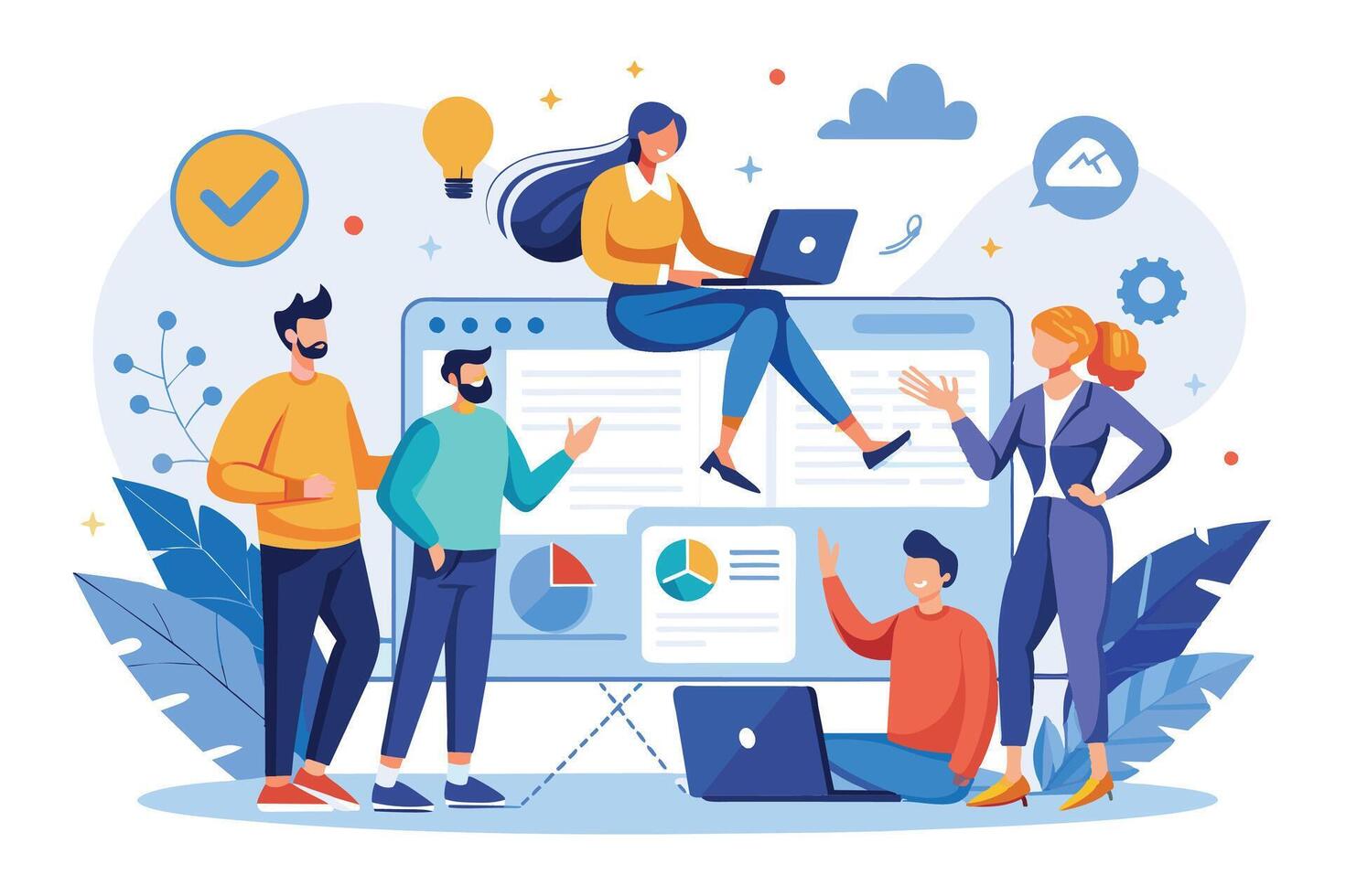 An illustration of a team of four diverse professionals collaborating on a digital project. They are using laptops, charts, and a large computer screen. vector