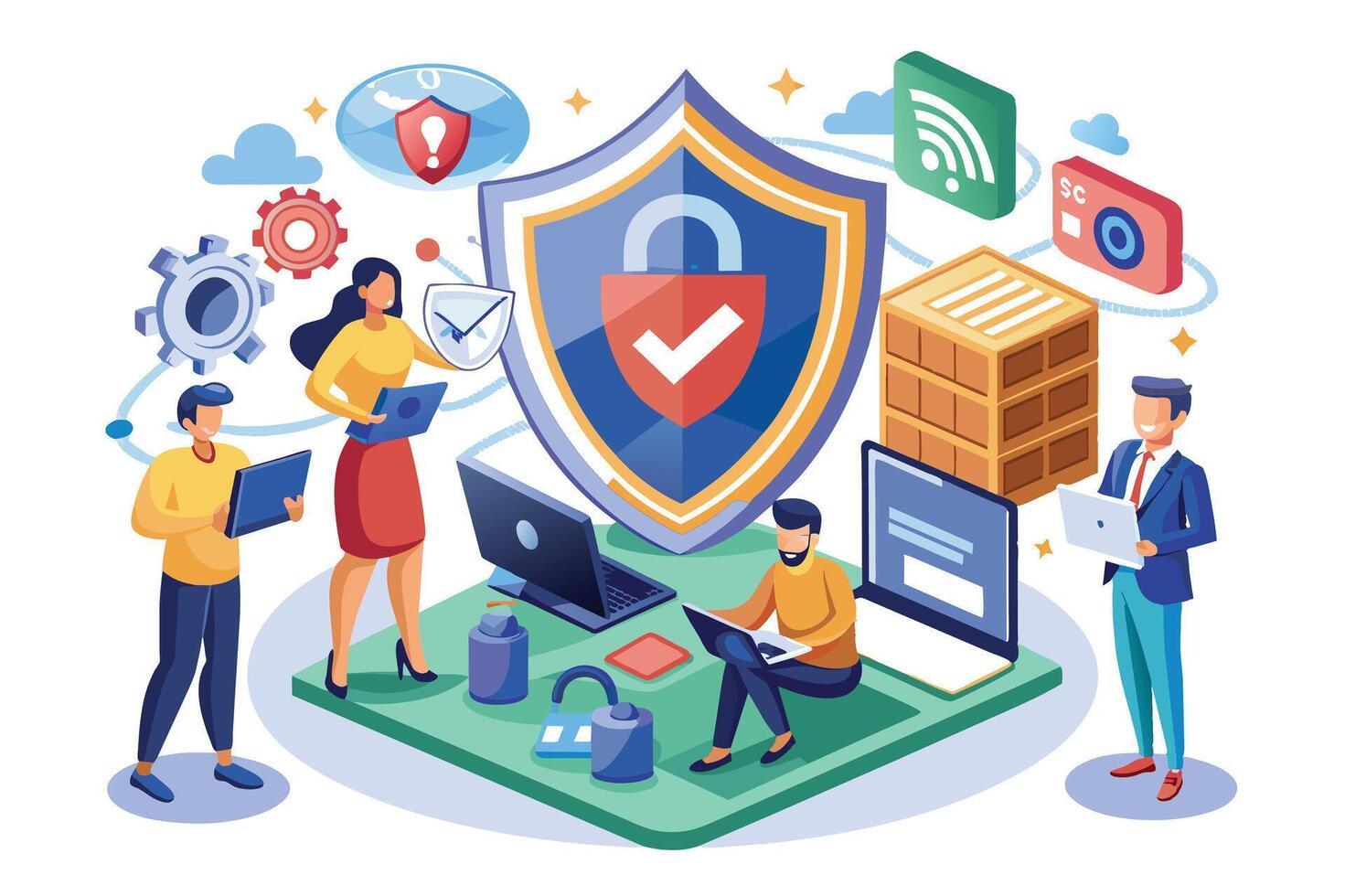Illustration depicting a secure digital platform for businesses with secure data and network access, featuring a large shield symbol, people using laptops, and network connectivity icons. vector
