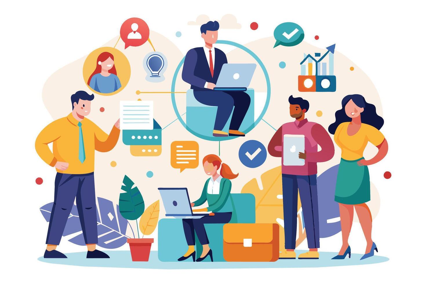 An illustration depicting a diverse team of professionals collaborating on a project, using laptops, digital documents, and a shared digital workspace. vector