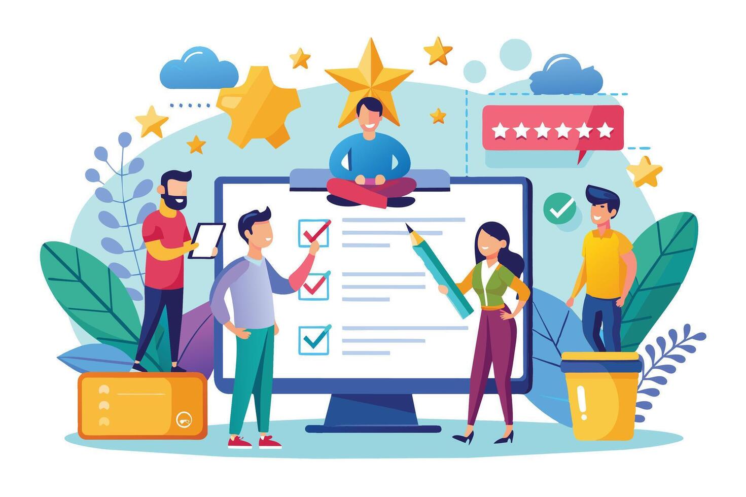 A group of people working on a checklist on a computer screen with positive feedback symbols like a 5-star rating and a trophy. vector
