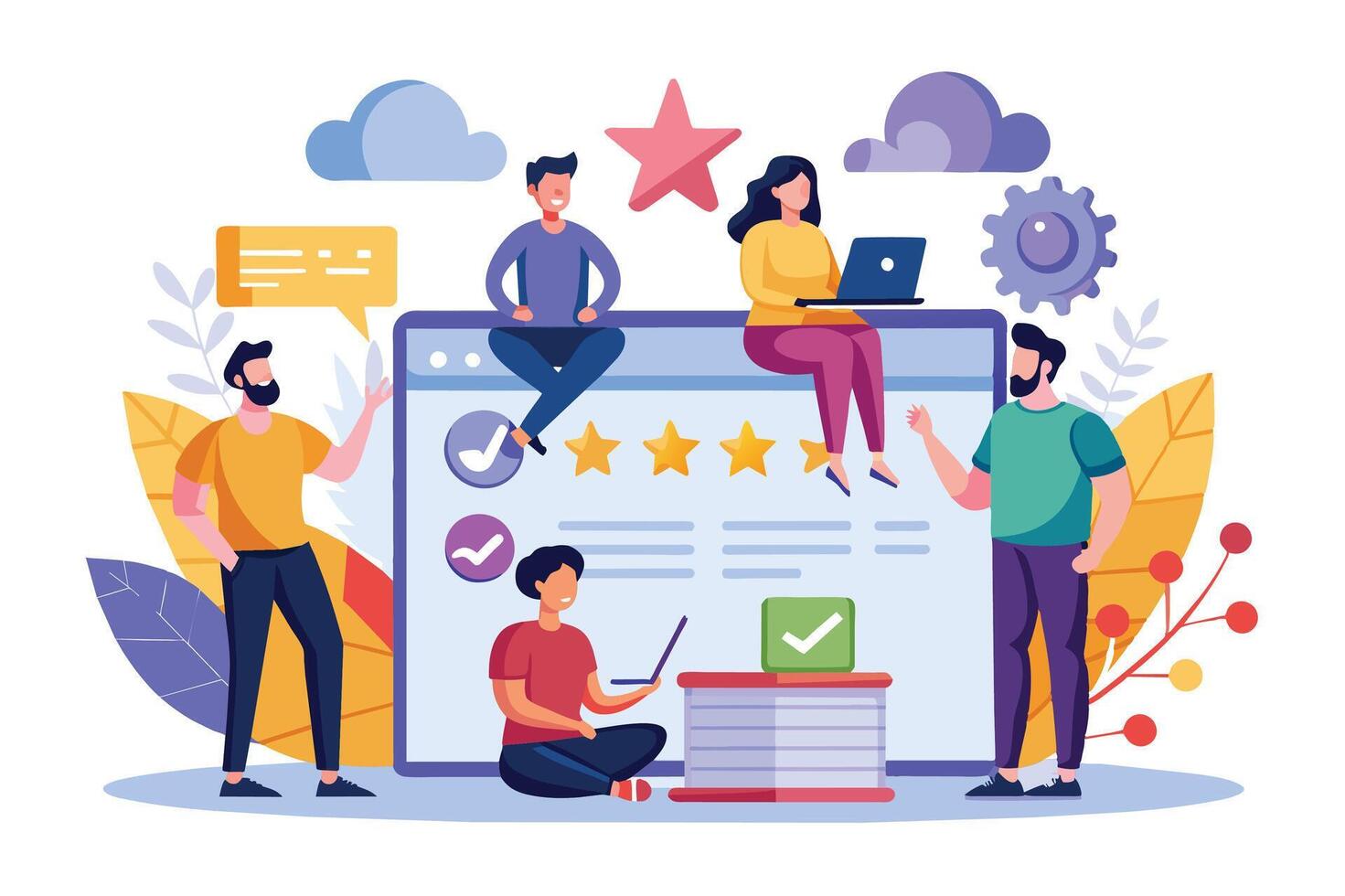 Illustration of a team reviewing a website on a big screen with 5 stars and check marks for positive feedback and completion. vector