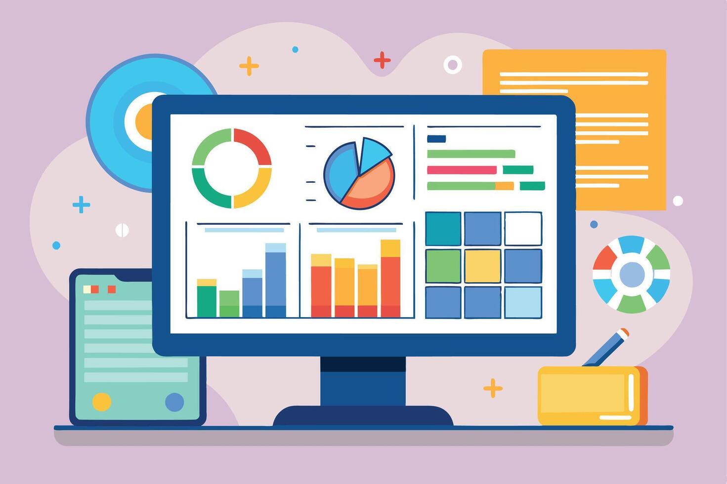 Illustration of a computer screen displaying various charts and graphs, including pie charts, bar graphs, and data tables, with a smartphone and other design elements. vector