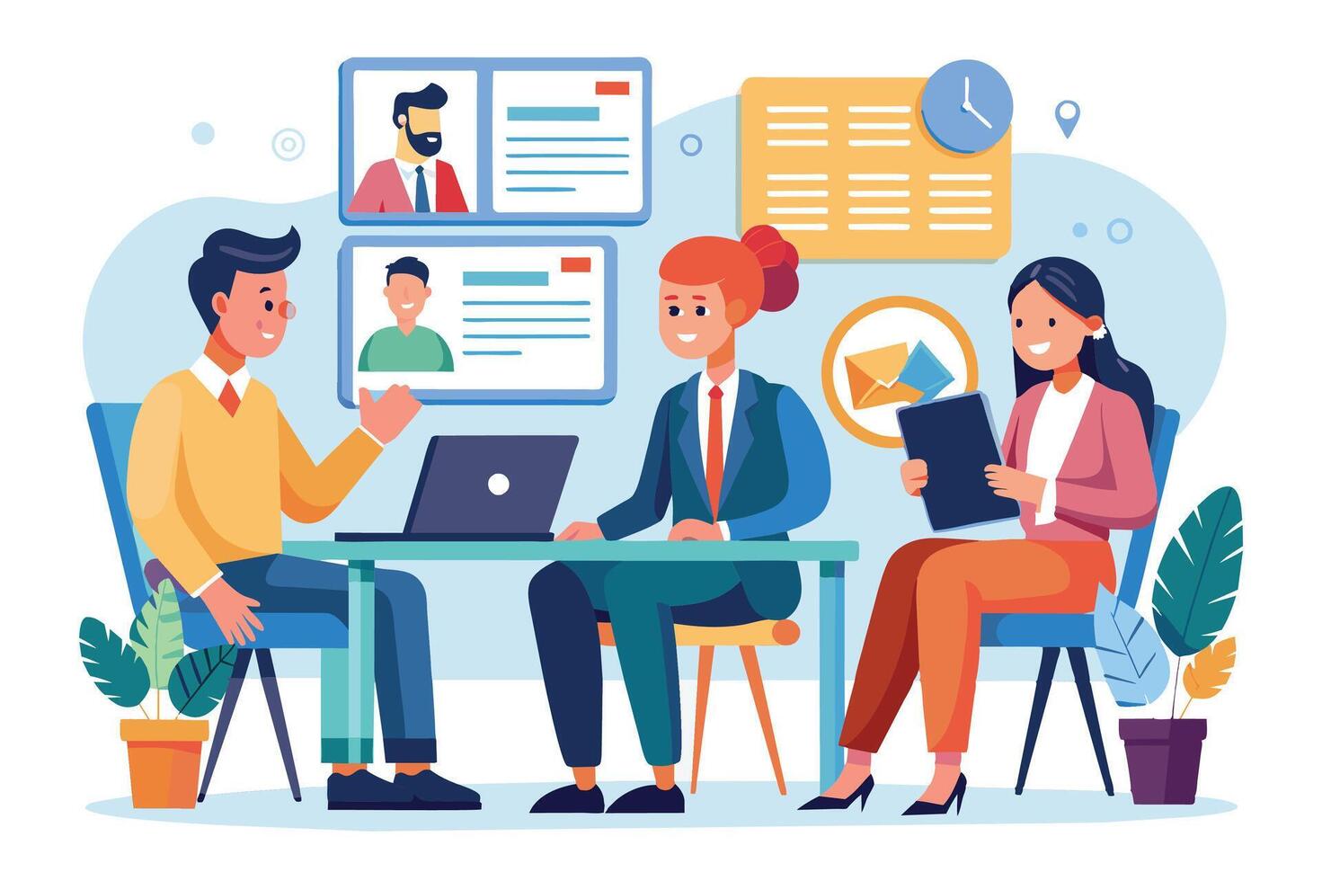A group of three professionals is gathered around a table in a meeting, discussing business. vector