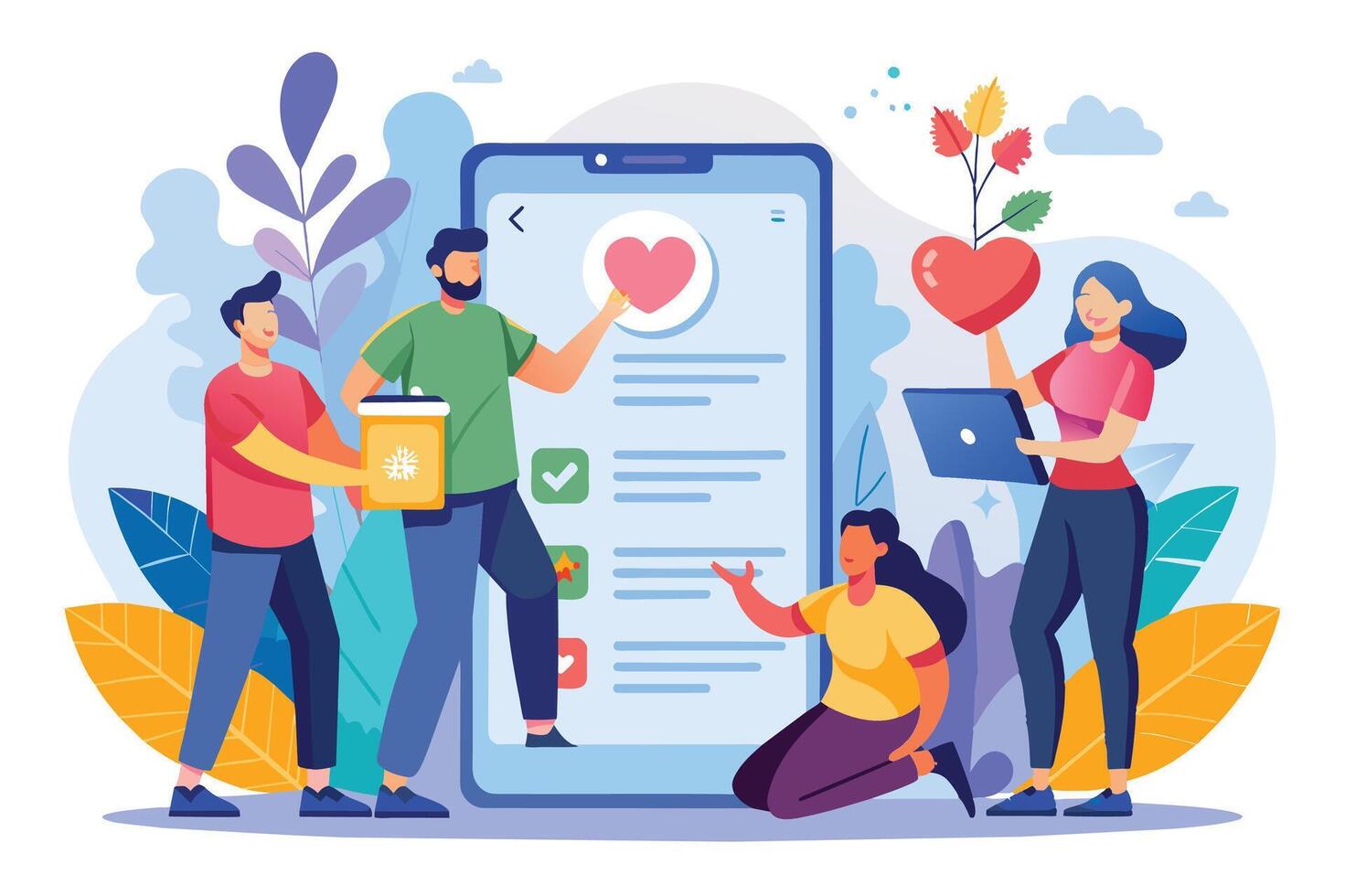 An illustration shows four people using a popular app on a large smartphone with a heart icon, animated and engaged in different ways. vector