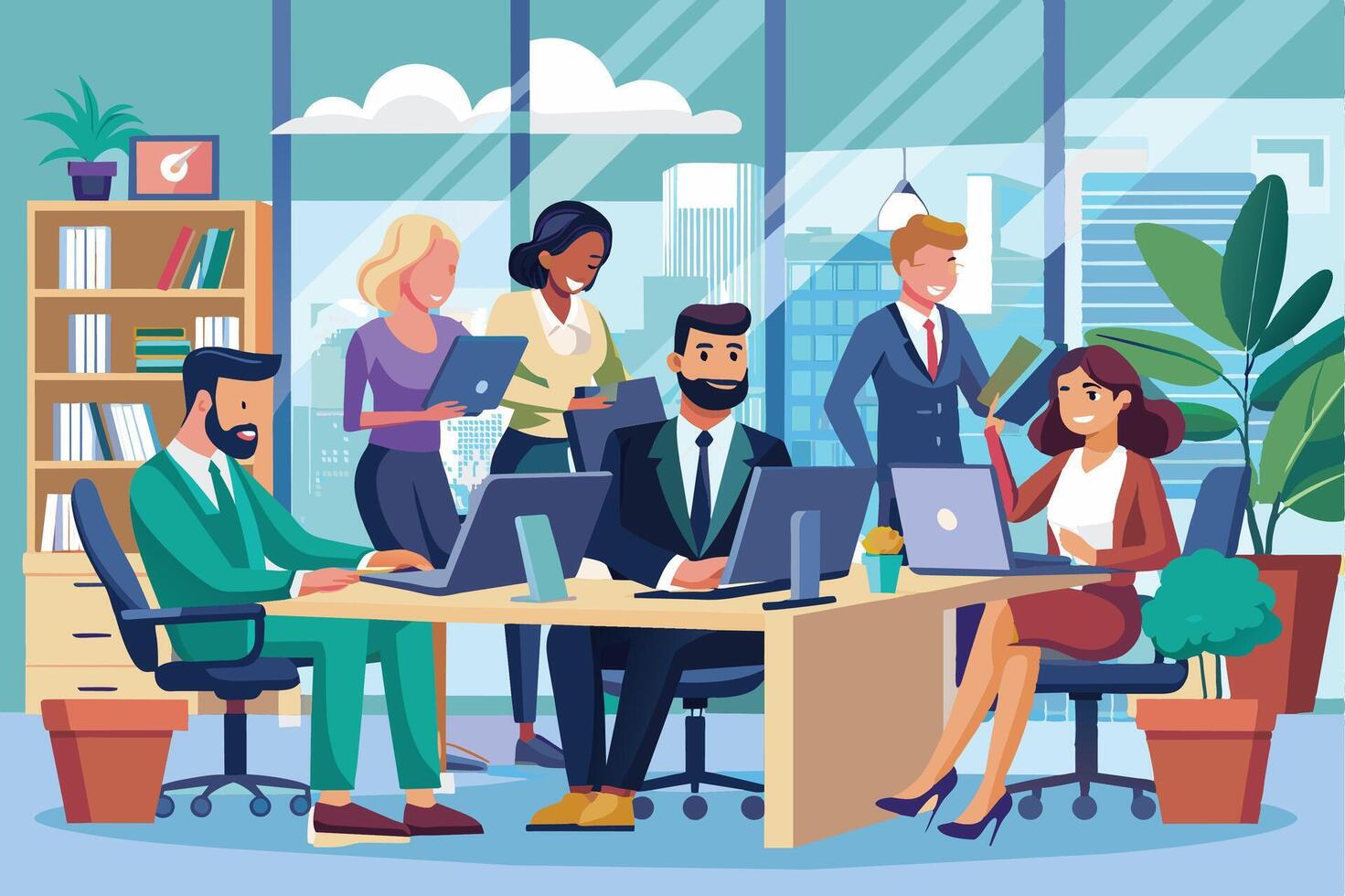 A group of diverse office workers collaborate on a project in a modern office setting. They are using laptops and working together to achieve a common goal. vector