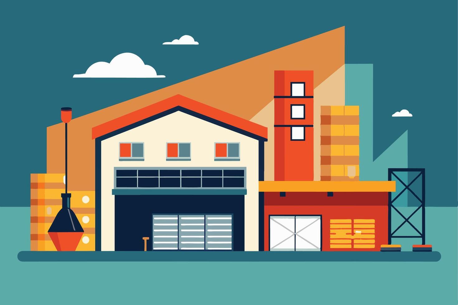 An illustration of a modern industrial building with cargo and a loading dock. The building has a red roof and large windows, with a loading dock in the front. vector