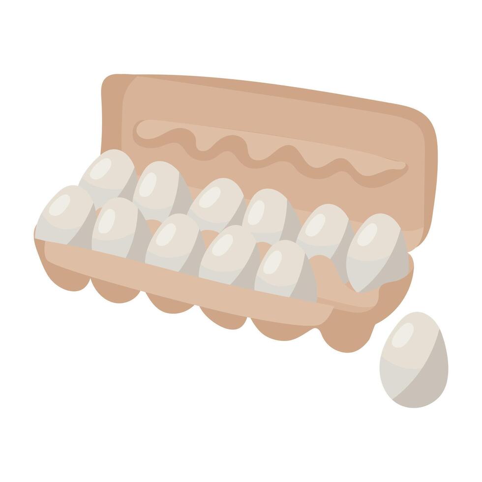 Package with fresh white chicken eggs. The open container with a lid is made of recyclable cardboard. Ingredients can be used for baking, cooking, or breakfast. A container completely filled with eggs Pro Vector