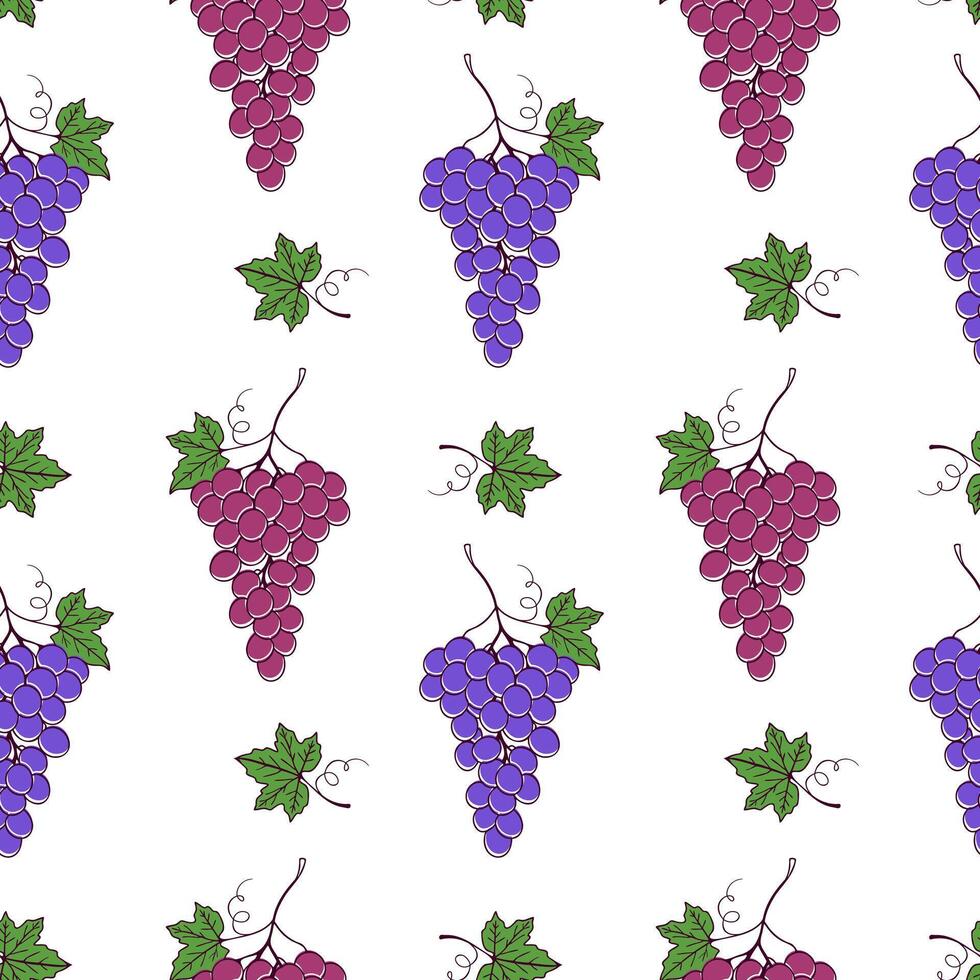 Grape seamless pattern on white background, contour doodle drawing of grape berries and leaves. Pro Vector