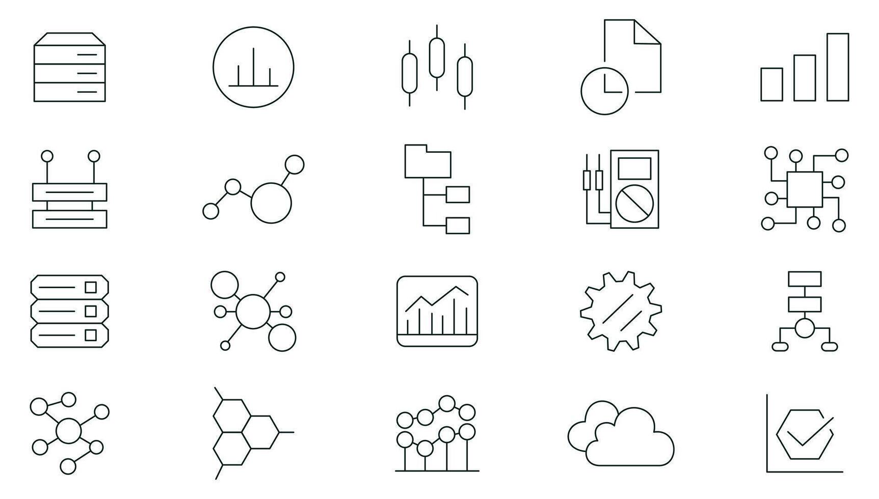 Data analysis thin line web icon set. Information technology web icon set. Database, big data process, ai, monitoring, traffic, hosting service, optimization and backup outline icon set collection. Pro Vector