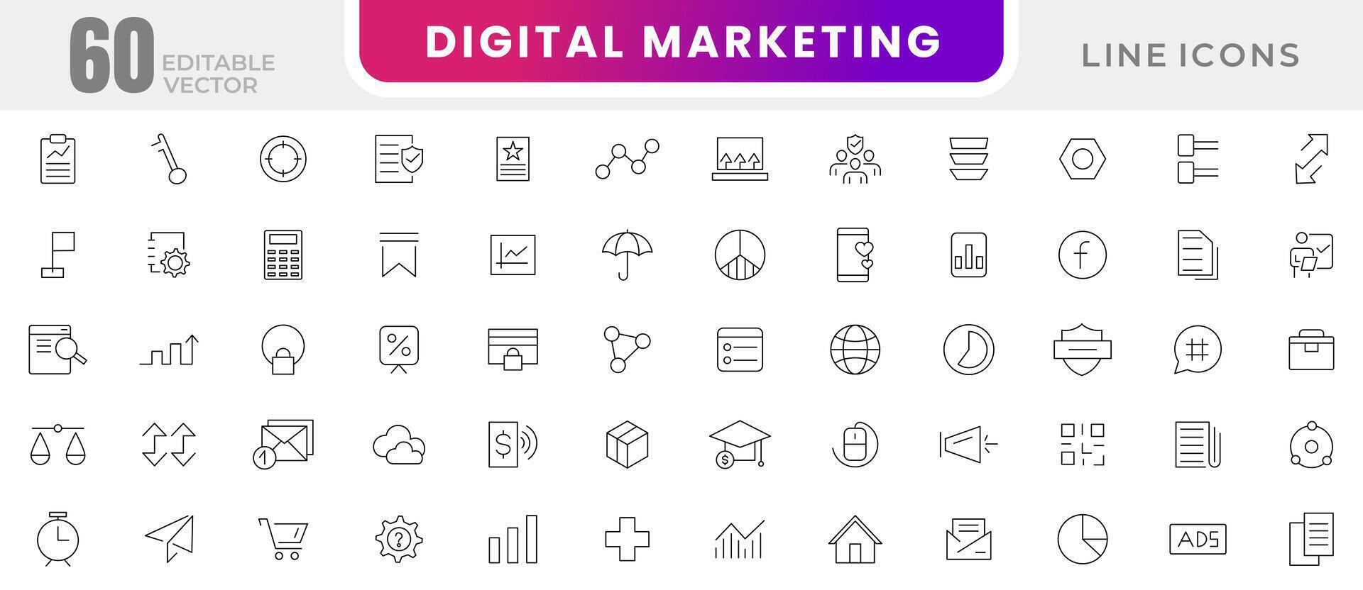 Digital Marketing line icons set. Social, networks, feedback, content, search, ecommerce, seo, internet, analysis, marketing and search engine optimization outline icons collection. Pro Vector