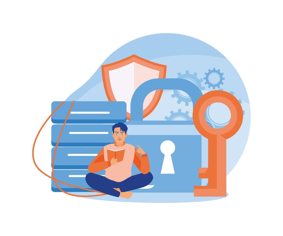 Man reading a book about how to store electronic data. Use applications that are safe from hackers. Database concept. Flat illustration. Pro Vector