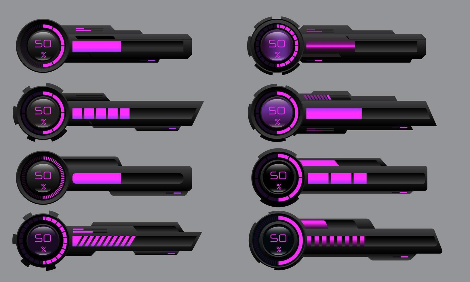 Set of HUD modern loading progress bars user interface elements design technology cyber purple black metallic futuristic Pro Vector